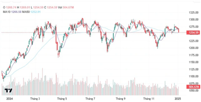 VN-Index năm 2024 chủ yếu tích quỹ quanh mốc 1.300 điểm.