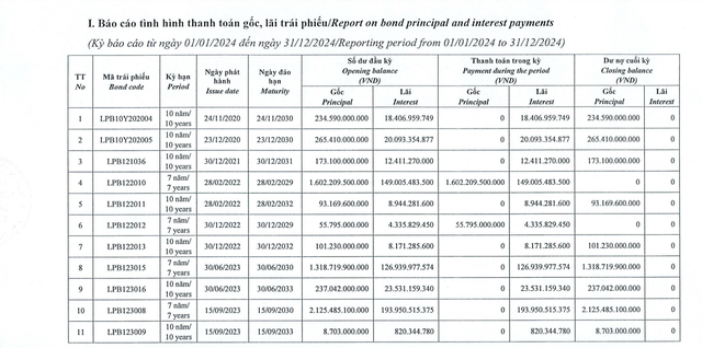 Theo báo cáo này, trong năm 2024, LPBank đã tiến hành tất toán 2 lô trái phiếu LPB122010 hơn 1.602 tỷ đồng và lô LPB122012 gần 55,8 tỷ đồng.