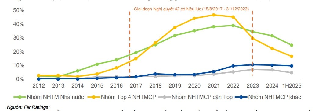 FiinRatings nhận định, việc luật hóa Nghị quyết 42 sẽ có tác động mạnh mẽ nhất lên 2 nhóm chính, gồm ngân hàng thương mại Nhà nước và nhóm top 4 ngân hàng TMCP (MB, Techcombank, ACB và VPBank).