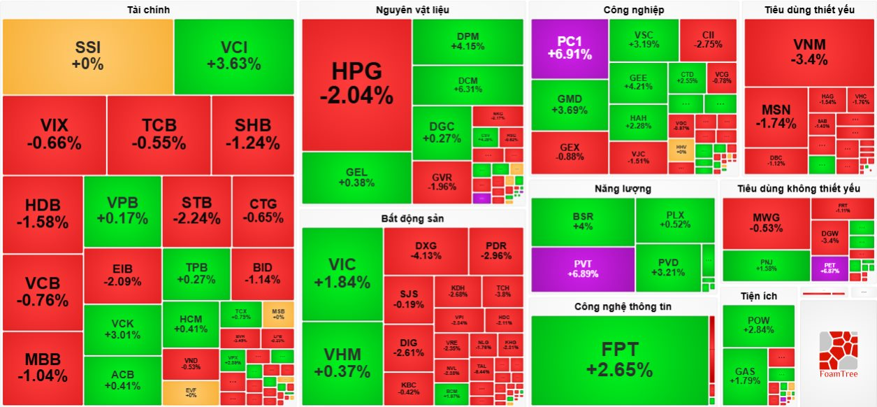 Ngoài hai nhóm ngành trên, một số cổ phiếu vốn hóa lớn tại nhóm ngành khác tăng bứt phá, góp phần nâng đỡ chỉ số VN-Index thoát hiểm phút cuối, như: FPT +2,65%, PNJ +1,58%, PC1 +6,91%, VSC +3,19%, GEE +4,21%, GMD +3,69%, VPX +2,89%, VCK +3,01%, …