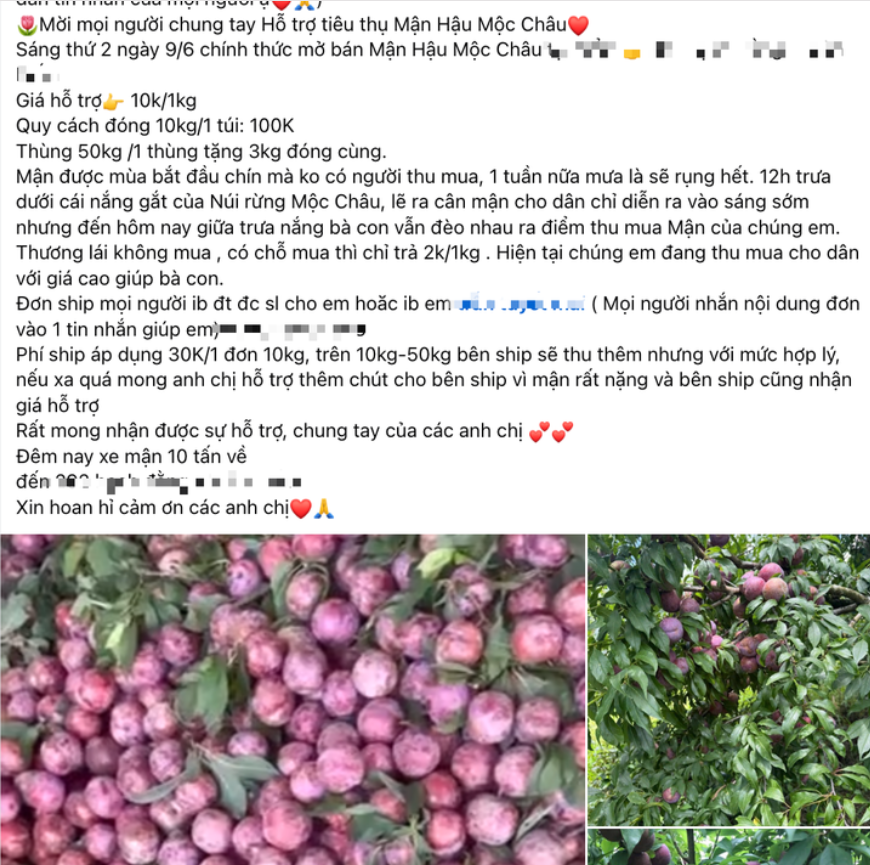 Một bài đăng trên Facebook kêu gọi hỗ trợ tiêu thụ mận hậu Mộc Châu - Ảnh: Chụp màn hình