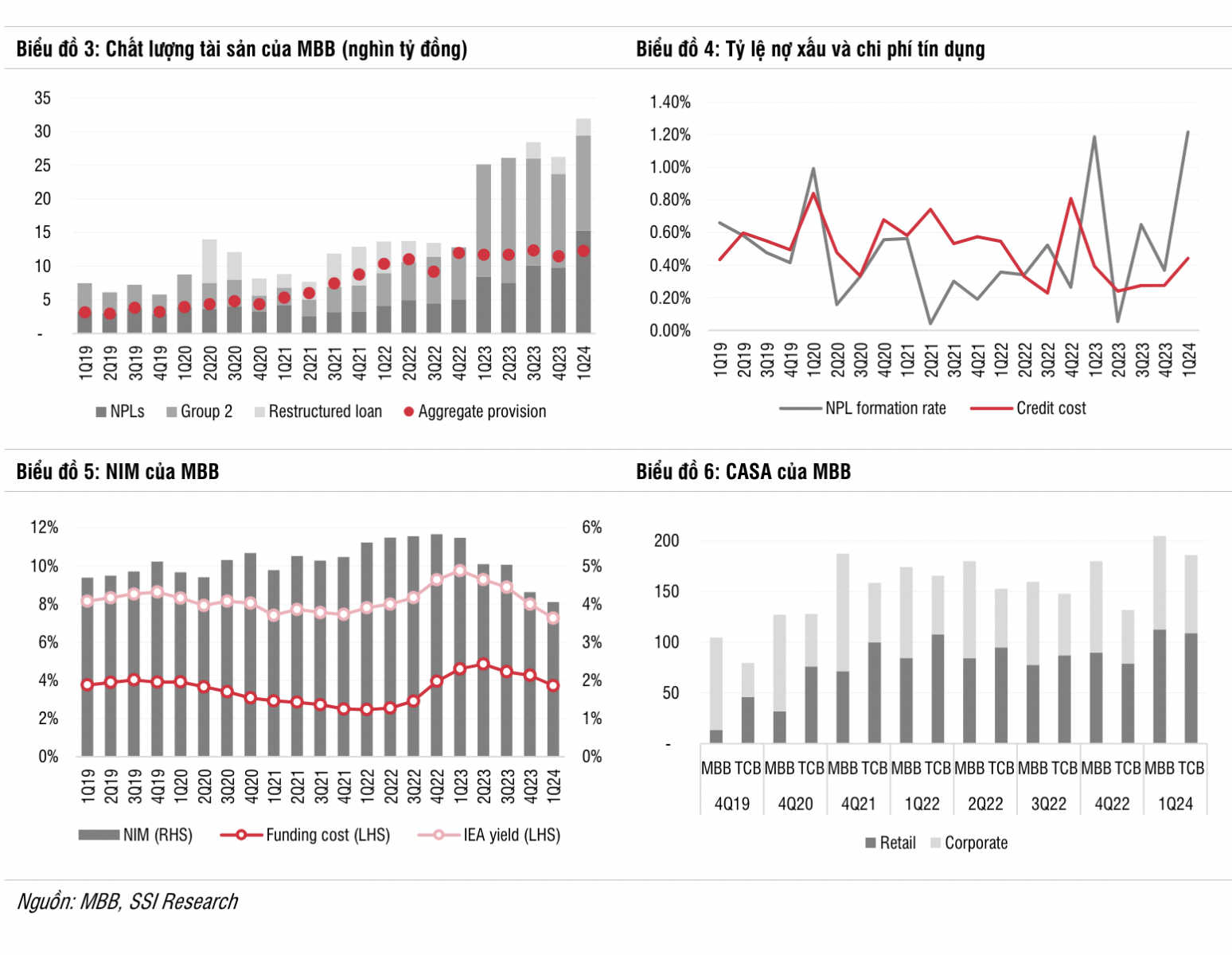 Báo cáo nhận định về MBB của Công ty Chứng khoán SSI cho thấy, mặc dù NIM giảm trong 2 quý liên tiếp vừa qua, MBB kỳ vọng NIM sẽ không giảm thêm trong các quý còn lại trong năm do lợi suất cho vay trung bình sẽ cải thiện khi khách hàng bị hạ nhóm nợ liên đới theo CIC được nâng lên nợ tiêu chuẩn; Chi phí vốn có thể không thay đổi hoặc giảm nhẹ do lãi suất huy động dự kiến sẽ tăng từ quý 4/2024; Đặc biệt CASA sẽ duy trì ổn định do 55% tổng CASA đến từ khách hàng bán lẻ và nhu cầu tín dụng có dấu hiệu phục hồi trong 2 tháng qua.