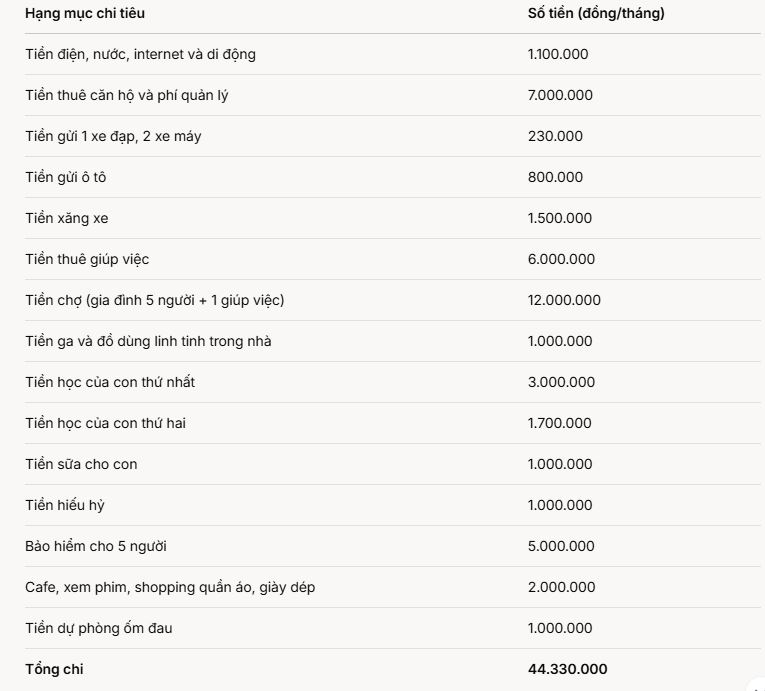 Chưa mua căn hộ chung cư vì hai vợ chồng chị Hòa lo ngại việc vay tiền vượt quá khả năng chi trả, phần vì các con còn nhỏ và đông, phần vì cần giữ vốn để làm ăn. Nhà đông người, lại bận rộn với công việc kinh doanh, chị Hòa thuê thêm một người giúp việc để hỗ trợ. Mỗi tháng, tổng các khoản chi cố định mà chị phải chi trả đều đặn bao gồm: