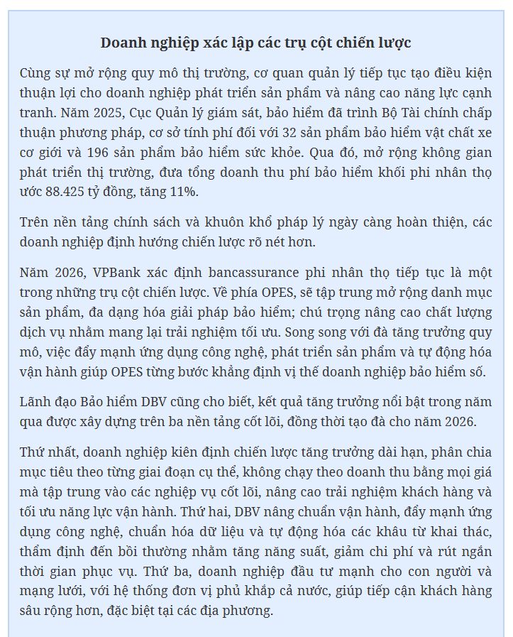 Hội nghị Triển khai chiến lược năm 2026 mảng bảo hiểm phi nhân thọ do VPBank phối hợp với Bảo hiểm OPES tổ chức cũng điểm lại một năm tăng trưởng ấn tượng. Theo đó, mảng bảo hiểm phi nhân thọ của VPBank ghi nhận doanh thu phí đạt 1.700 tỷ đồng.