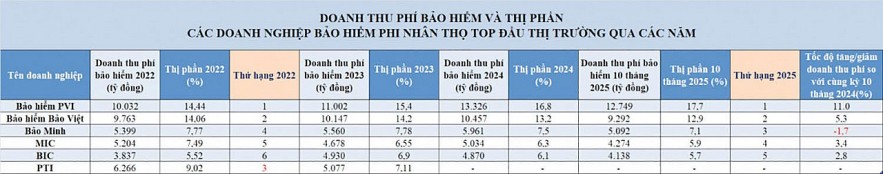 Ngay trong nhóm đầu ngành, cạnh tranh cũng ngày càng gay gắt. PVI tiếp tục dẫn đầu với thị phần 17,7% trong 10 tháng 2025, cao hơn những năm trước dao động từ 14 - 17%. Doanh thu phí gốc đạt 12.749 tỷ đồng, tăng 11% cùng kỳ, cho thấy vừa mở rộng quy mô, vừa mở rộng “miếng bánh” thị phần.