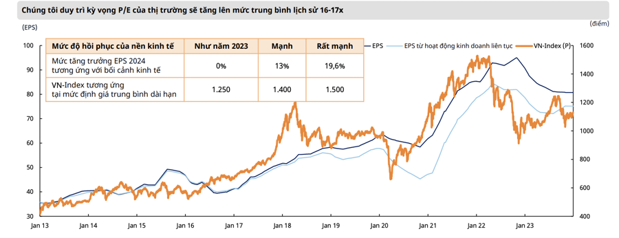Trong kịch bản mức độ hồi phục của nền kinh tế như năm 2023, EPS 2024 tăng trưởng 0%, VN-Index tương ứng tại mức định giá trung bình dài hạn sẽ ở vùng điểm 1.250. Tại kịch bản nền kinh tế phục hồi mạnh và EPS 2024 tăng trưởng 13%, chỉ số VN-Index có thể giao dịch tại vùng 1.400 điểm và nếu nền kinh tế tăng trưởng rất mạnh với EPS tăng 19,6%, VN-Index có thể chạm mốc 1.500 điểm.