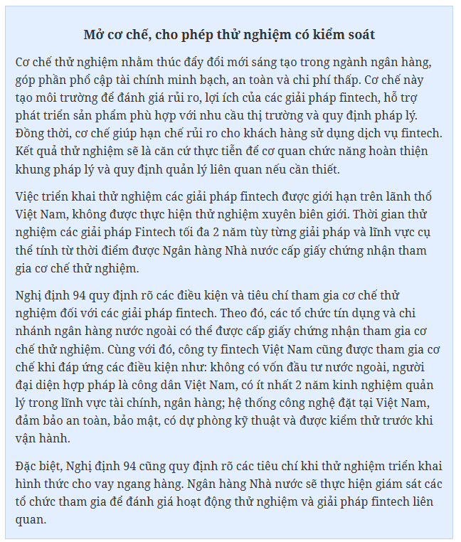 94/2025/NĐ-CP quy định cơ chế thử nghiệm kiểm soát trong ngân hàng (Nghị định 94) và có hiệu lực kể từ ngày 1/7 tới đây.