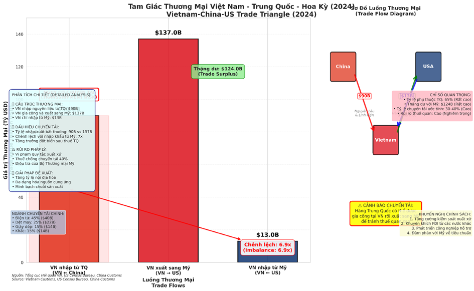 Hình 5: Biểu đồ Tam giác Thương mại Việt Nam - Trung Quốc - Hoa Kỳ (2024) minh họa sự mất cân bằng