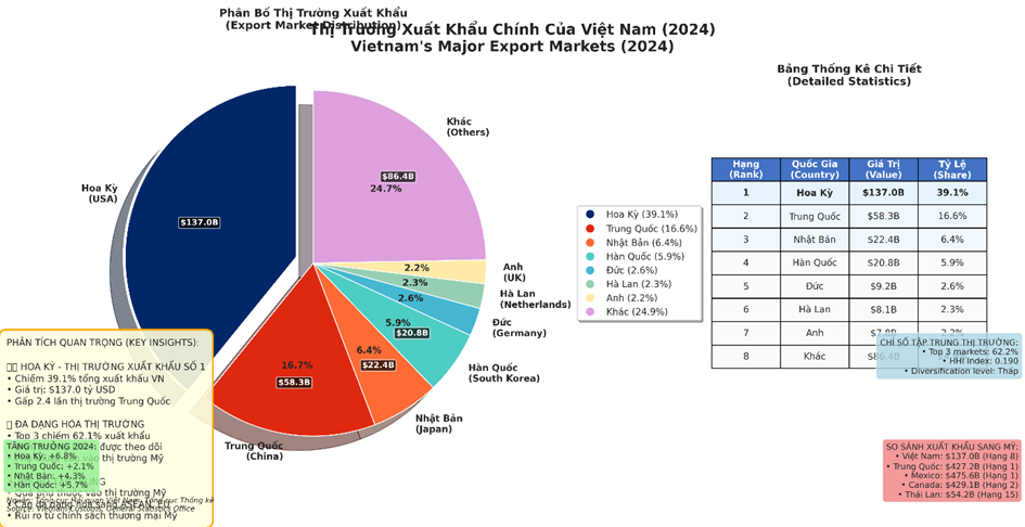 o Thị trường Mỹ chiếm tới 39,1% tổng kim ngạch xuất khẩu của Việt Nam, là thị trường xuất khẩu lớn nhất và quan trọng nhất.