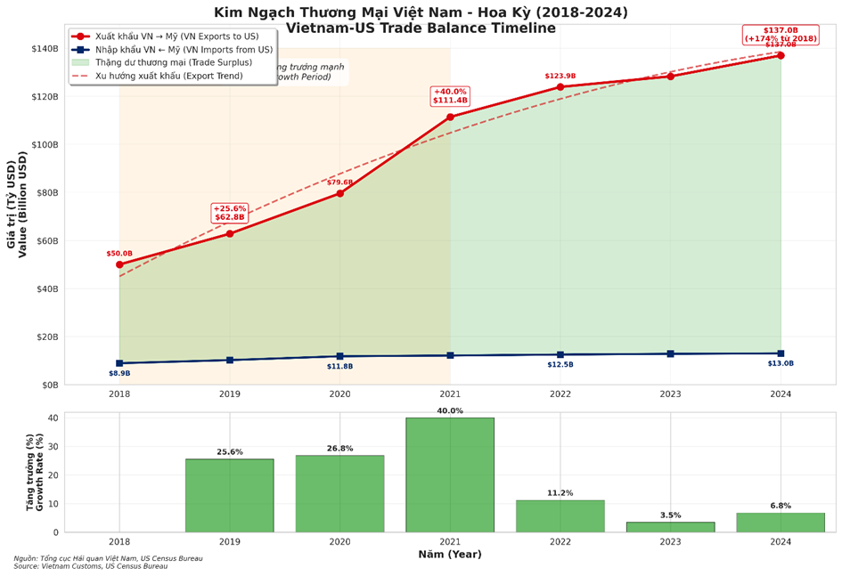 o Kim ngạch xuất khẩu sang Mỹ đã tăng trưởng phi mã, từ 50 tỷ USD (2018) lên 137 tỷ USD (2024), tăng 174% chỉ trong 6 năm.
