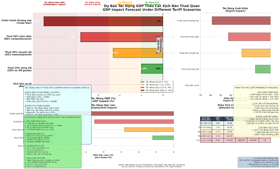 Kịch bản cơ sở (Thuế 20% - Đạt được): Tác động dự báo là trung tính đến tiêu cực nhẹ (-0% GDP), nhưng sẽ gây ra sự sụt giảm đáng kể việc làm trong các ngành thâm dụng lao động.