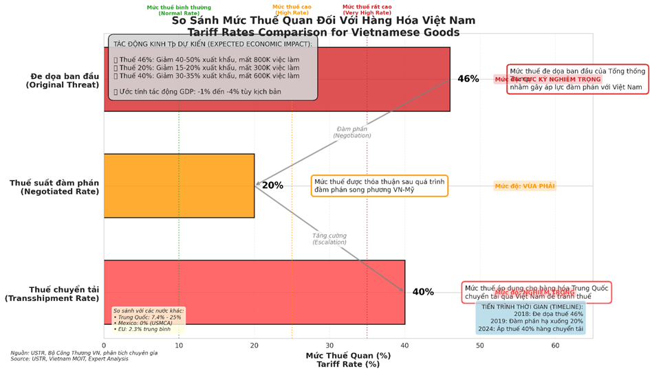 Thỏa thuận tháng 7 không thể được hiểu một cách riêng lẻ. Nó là kết quả trực tiếp của một cuộc khủng hoảng do thông báo của chính quyền Trump vào tháng 4 năm 2025 về kế hoạch áp đặt mức thuế 46% bao trùm lên hầu hết hàng nhập khẩu của Việt Nam. Mối đe dọa này được coi là một sự kiện có khả năng gây ra thảm họa. Viễn cảnh này đã gây ra những cú sốc trên toàn nền kinh tế, khiến chỉ số VN-Index sụt giảm nghiêm trọng và các hiệp hội ngành hàng như Dệt may (VITAS) dự báo tổn thất hàng tỷ USD. Nhìn trong bối cảnh này, mức thuế cuối cùng là 20%, dù vẫn gây thiệt hại, nhưng lại là một "chiến thắng" đáng kể cho các nhà đàm phán của Hà Nội, giúp kiểm soát thiệt hại và ổn định kinh tế vĩ mô.