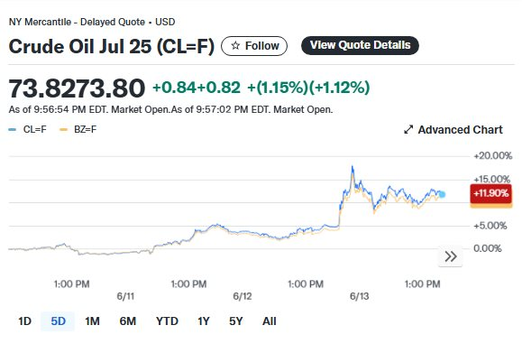 Giá dầu tăng mạnh vào cuối tuần sau tin Israel phóng tên lửa vào Iran. Dầu Brent tiến sát mốc 74 USD/thùng, trong khi dầu WTI giao dịch gần 73 USD/thùng. Cả hai đều tăng hơn 12% trong tuần.(1).png)