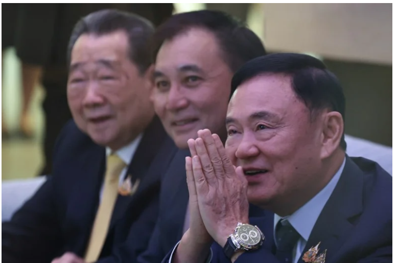 Hai người giàu nhất Thái Lan, Dhanin Chearavanont (bìa trái) và Sarath Ratanavadi, cùng Thaksin Shinawatra tại diễn đàn “Tầm nhìn cho Thái Lan”, nơi cựu Thủ tướng Thái Lan là tâm điểm chú ý, hôm 22/8/2024 tại Bangkok. Ảnh: Reuters