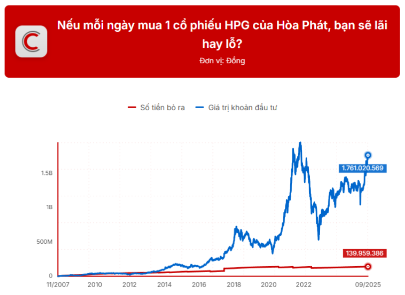 Nếu đều đặn mỗi ngày mua 1 cổ phiếu HPG, và duy trì thói quen này trong gần 18 năm qua, tính đến hiện tại, nhà đầu tư sẽ nắm trong tay 58.799 cổ phiếu (đã bao gồm các cổ phiếu thưởng, và giả sử thực hiện đầy đủ quyền mua). Số vốn bỏ ra sau 18 năm là gần 140 triệu đồng.