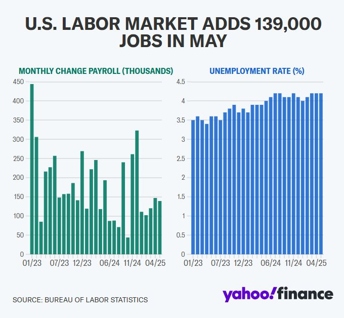 Số việc làm phi nông nghiệp hàng tháng (xanh lá) và tỷ lệ thất nghiệp (xanh dương) tại Mỹ tính đến tháng 5/2025.