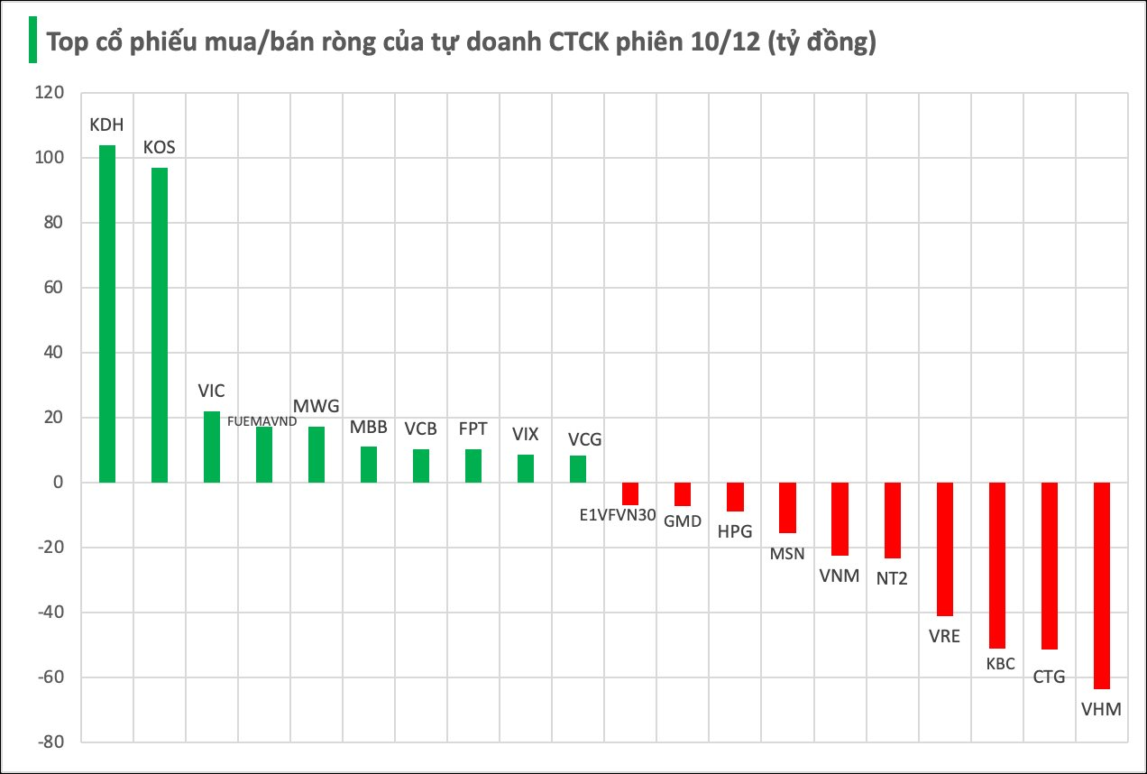 Cụ thể, KDH được mua ròng mạnh nhất với giá trị 104 tỷ đồng, theo sau là KOS (97 tỷ), VIC (22 tỷ), FUEMAVND (17 tỷ), MWG (17 tỷ), MBB (11 tỷ), VCB (10 tỷ), FPT (10 tỷ), VIX (9 tỷ) và VCG (8 tỷ đồng) – đều nằm trong nhóm được tự doanh CTCK mua ròng tích cực.
