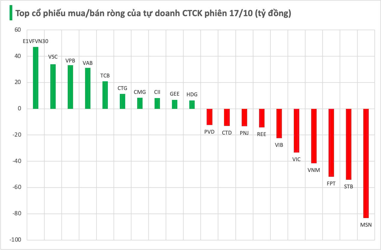 Cụ thể, nhóm CTCK bán ròng mạnh nhất tại MSN với giá trị -83 tỷ đồng, tiếp theo là STB (-54 tỷ), FPT (-52 tỷ), VNM (-41 tỷ) và VIC (-33 tỷ đồng). Một số cổ phiếu khác cũng ghi nhận lực bán ròng đáng kể như VIB (-22 tỷ), REE (-14 tỷ), PNJ (-13 tỷ), CTD (-13 tỷ) và PVD (-12 tỷ đồng).
