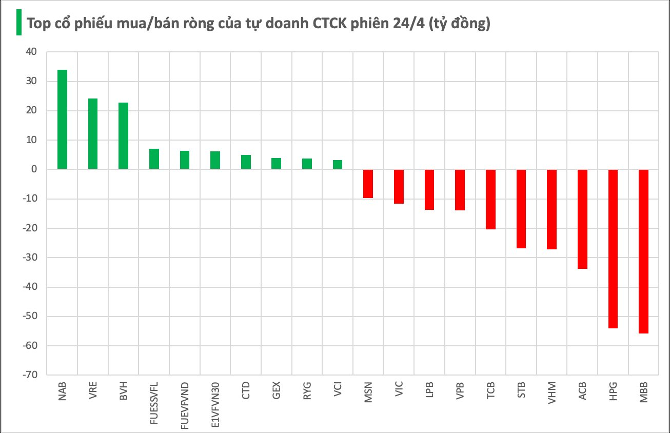 Ngược lại, giao dịch của các CTCK mua ròng NAB và VRE với giá trị lần lượt là 34 tỷ và 24 tỷ. Các mã được mua ròng còn có BVH, FUESSVFL, FUEVFVND…