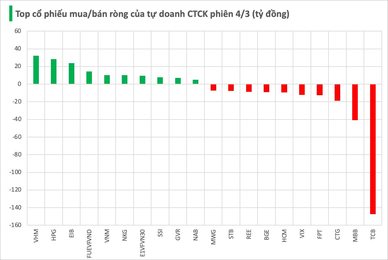 Ngược lại, giao dịch của các CTCK mua ròng VHM và HPG với 32 tỷ và 28 tỷ. Bên cạnh đó, các cổ phiếu như EIB, FUEVFVND, VNM, NKG … cũng được mua ròng trong phiên 4/3.