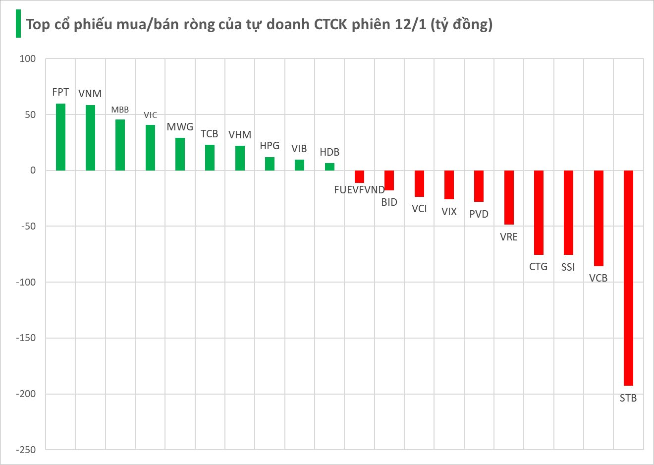 Cụ thể, nhóm tự doanh CTCK bán ròng mạnh nhất tại STB với giá trị -193 tỷ đồng, tiếp theo là VCB (-86 tỷ), SSI (-76 tỷ), CTG (-75 tỷ) và VRE (-49 tỷ đồng). Một số cổ phiếu khác cũng ghi nhận lực bán ròng đáng kể như PVD (-28 tỷ), VIX (-26 tỷ), VCI (-24 tỷ), BID (-18 tỷ) và FUEVFVND (-11 tỷ đồng).