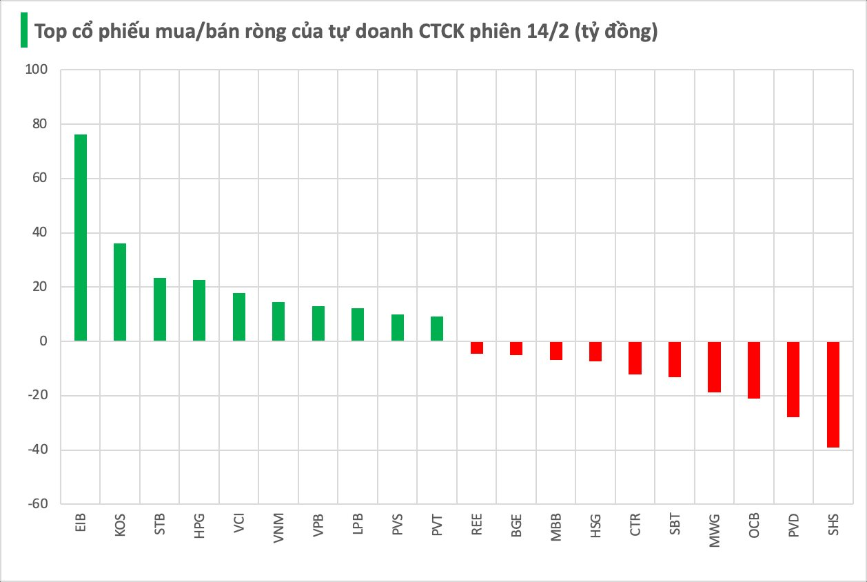 Cụ thể, giao dịch của các CTCK mua ròng EIB với giá trị 76 tỷ. Bên cạnh đó, các cổ phiếu như KOS, STB, HPG... cũng được mua ròng trong phiên 14/2.