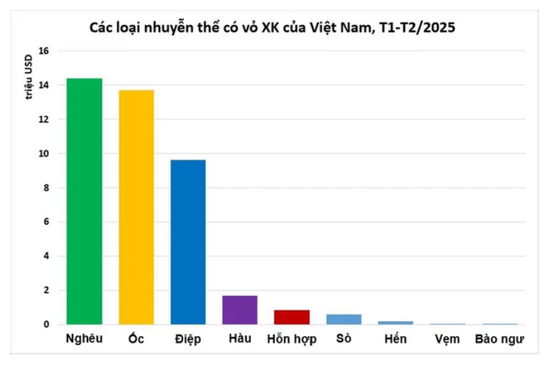 Nghêu tiếp tục là mặt hàng xuất khẩu lớn nhất trong nhóm nhuyễn thể có vỏ, đạt hơn 14 triệu USD, tăng 41% so với năm 2024 (10 triệu USD). Mặt hàng nghêu của Việt Nam đang có khả năng cạnh tranh tốt trên thị trường quốc tế.