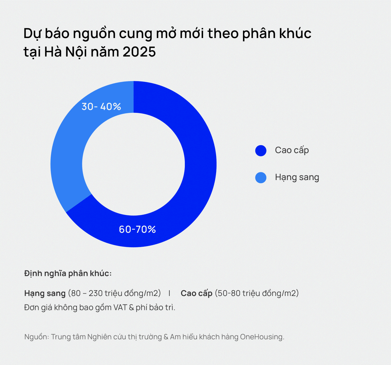 Nguồn cung căn hộ trung cấp sẽ gần như biến mất khỏi hai thị trường Hà Nội và TP.HCM, theo dự báo từ OneHousing. Lượng sản phẩm chung cư mở mới tại thị trường Hà Nội năm 2025 ước đạt khoảng 30.000 căn. Trong đó, khoảng 60-70% căn hộ cao cấp và 30-40% căn hộ hạng sang.
