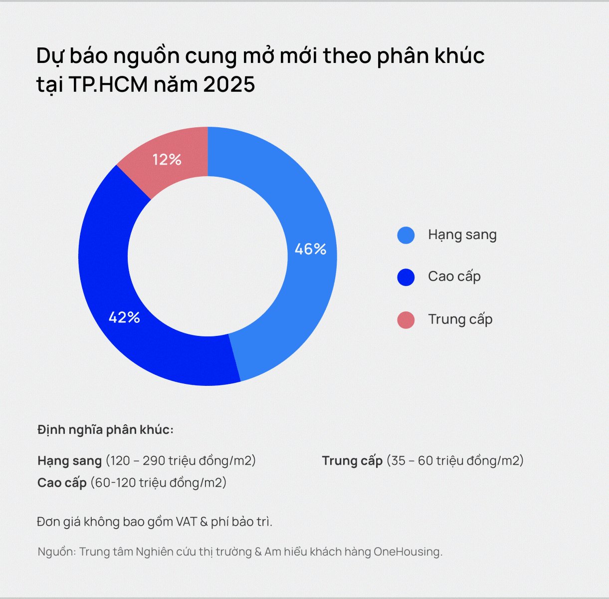 Tại thị trường TP.HCM, nguồn cung mở mới 2025 dự báo sẽ có khoảng 12.000 căn, trong đó nguồn cung cao cấp và hạng sang chiếm tới 88% (phân khúc cao cấp chiếm 42%, hạng sang chiếm 46%).