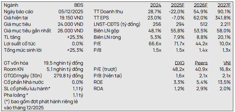 Về triển vọng bán hàng, Vietcap tiếp tục kỳ vọng DXG sẽ ghi nhận doanh số tăng mạnh, đạt 10.400 tỷ đồng trong năm 2025 và 19.800 tỷ đồng trong năm 2026, sau giai đoạn trầm lắng 2023–2024. Dự báo này được hỗ trợ bởi việc tái khởi động dự án The Privé từ giữa năm 2025 và GSW từ năm 2026.