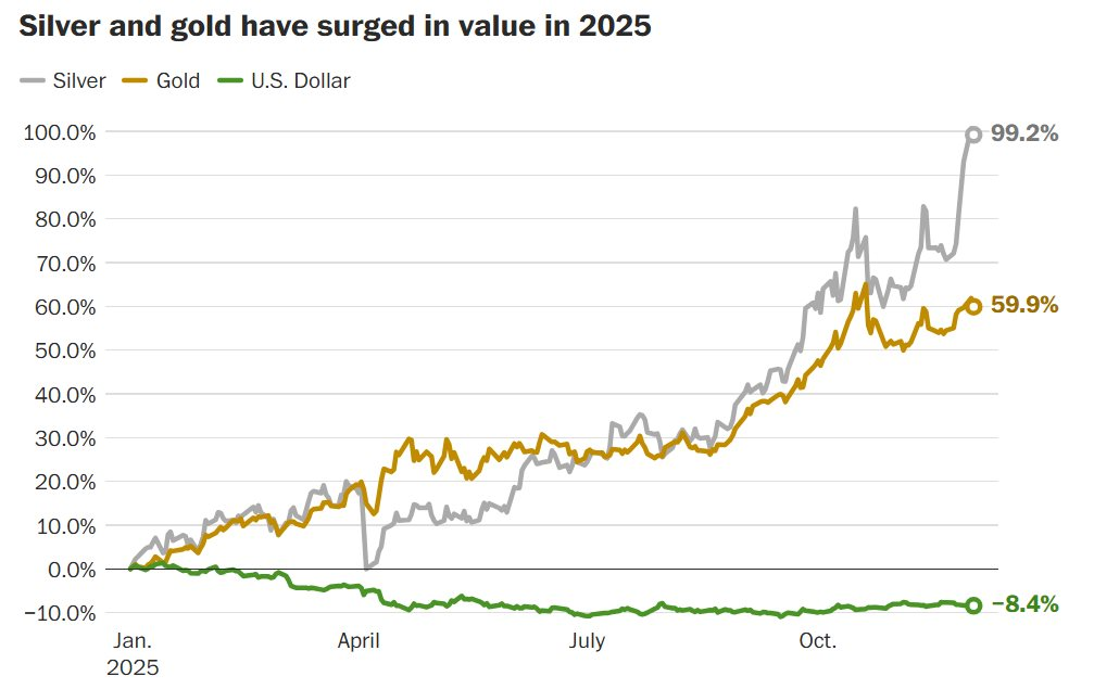 Giá bạc đã tăng hơn gấp đôi kể từ đầu năm và lập kỷ lục mới trong phiên giao dịch ngày 9/12. Lần đầu tiên, giá bạc vượt 60 USD/ounce trên sàn New York. Bạc hiện tăng 102% trong năm 2025, vượt xa mức tăng 59% của vàng.