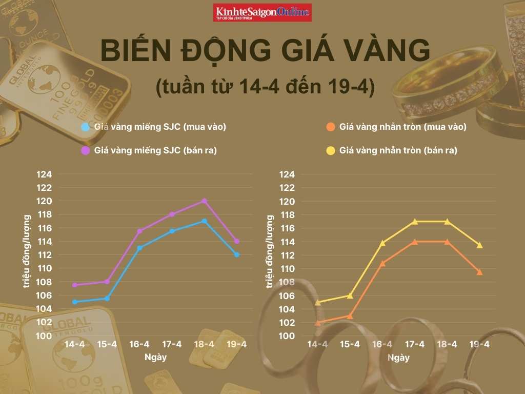Sau đây là biến động của thị trường vàng miếng, vàng nhẫn tuần từ ngày 14-4 đến ngày 19-4.
