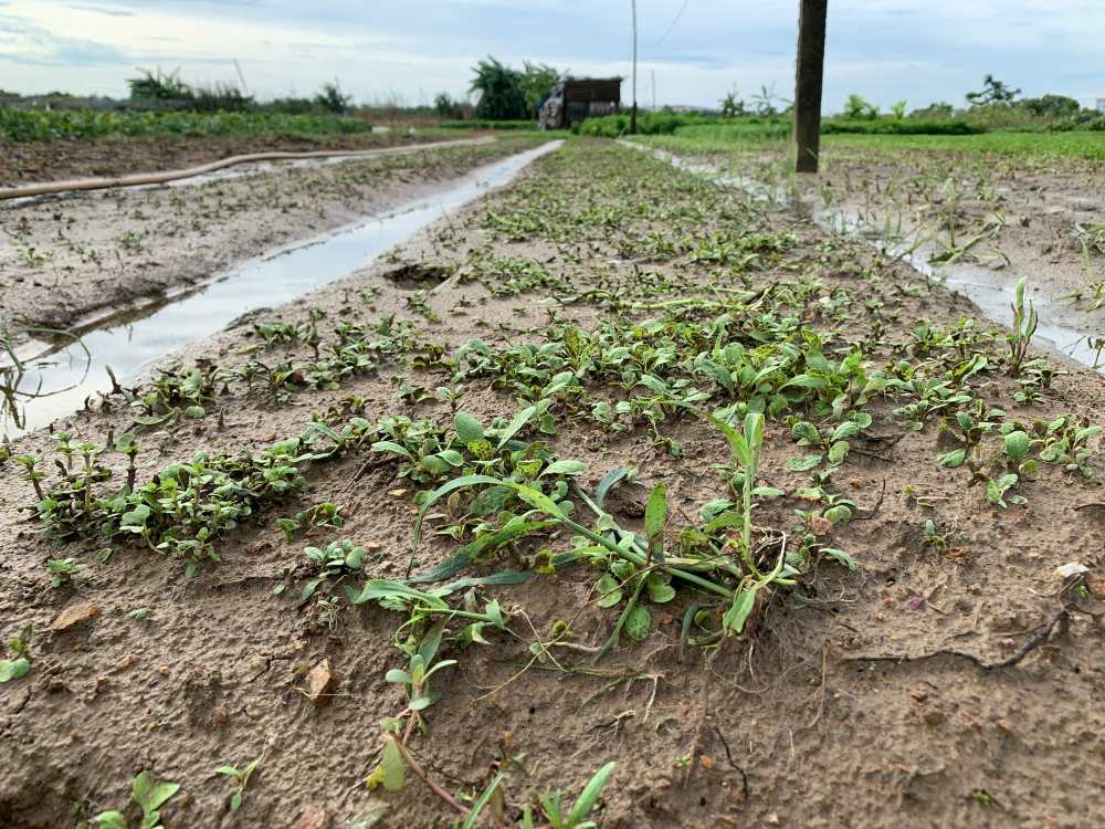 Rau dền, rau cải, rau muống mới gieo tại vùng sản xuất rau La Hường bị ngập sau nhiều ngày mưa lớn đợt bão số 10, nhiều hộ phải gieo trồng lại.