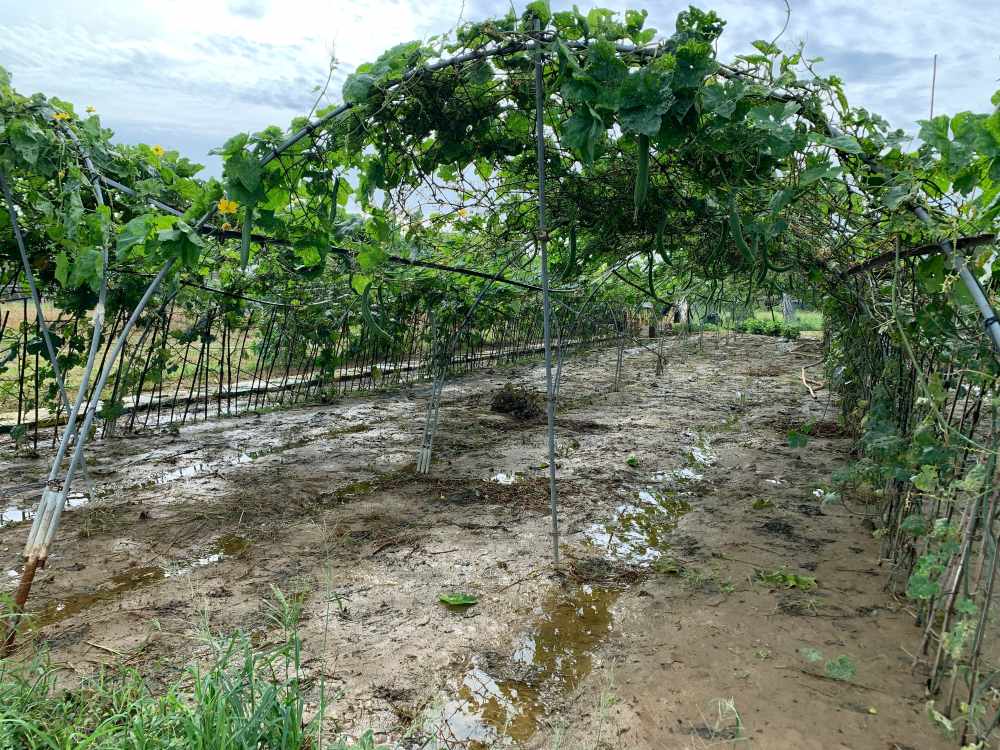 Các loại cây leo giàn như mướp, bầu, khổ qua bị ngập trong nước mưa lâu ngày khiến năng suất giảm đáng kể, những loại cây này khi ra trái mới sẽ bị rụng nên đa số các hộ canh tác đều phải nhổ bỏ đi để trồng lại lứa mới”.