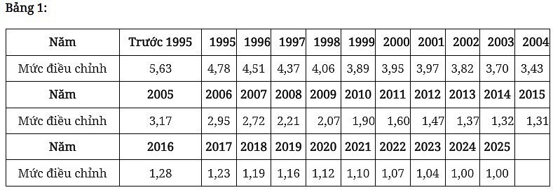 Trong đó, mức điều chỉnh tiền lương đã đóng BHXH của năm tương ứng được thực hiện theo Bảng 1 dưới đây: