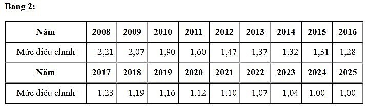 Trong đó, mức điều chỉnh thu nhập tháng đã đóng BHXH của năm tương ứng được thực hiện theo Bảng 2 dưới đây: