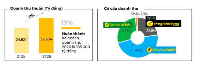 Cú rơi của MWG hiện tại diễn ra trong bối cảnh tình hình kinh doanh của doanh nghiệp vẫn khả quan. 2 tháng đầu năm, MWG ghi nhận doanh thu đạt 32.200 tỷ đồng, tăng 31% so với cùng kỳ 2025.