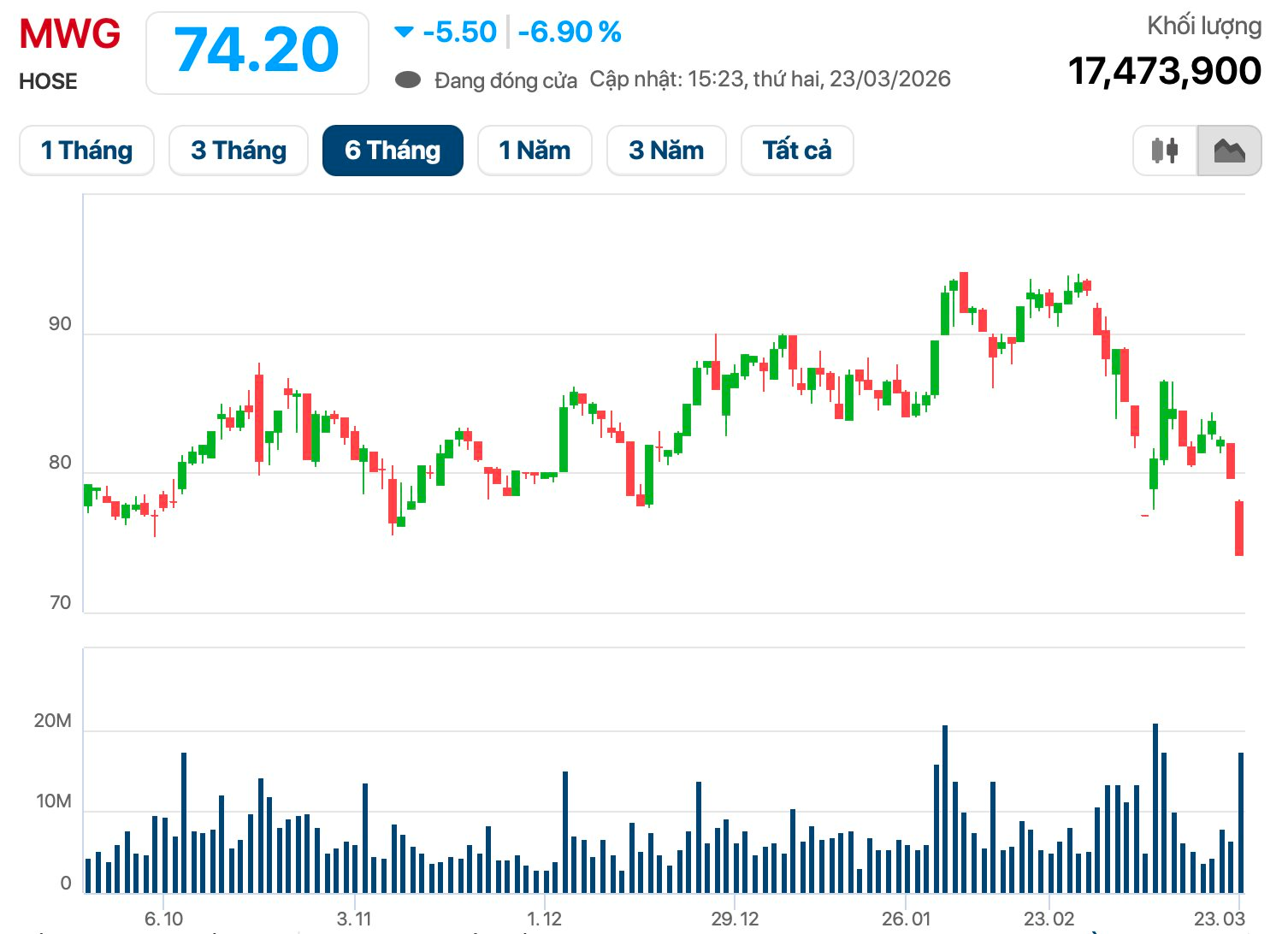 Cổ phiếu MWG của CTCP Đầu tư Thế Giới Di Động vừa trải qua phiên 23/3 bị bán tháo mạnh đến giảm sàn “trắng bên mua” về mức 74.200 đồng/cp, thấp nhất kể từ tháng 9 năm ngoái. Trong khoảng 1 tháng trở lại đây, MWG đã mất hơn 20% thị giá. Vốn hóa thị trường cũng theo đó “bốc hơi” 28.500 tỷ (hơn 1 tỷ USD) từ đỉnh.