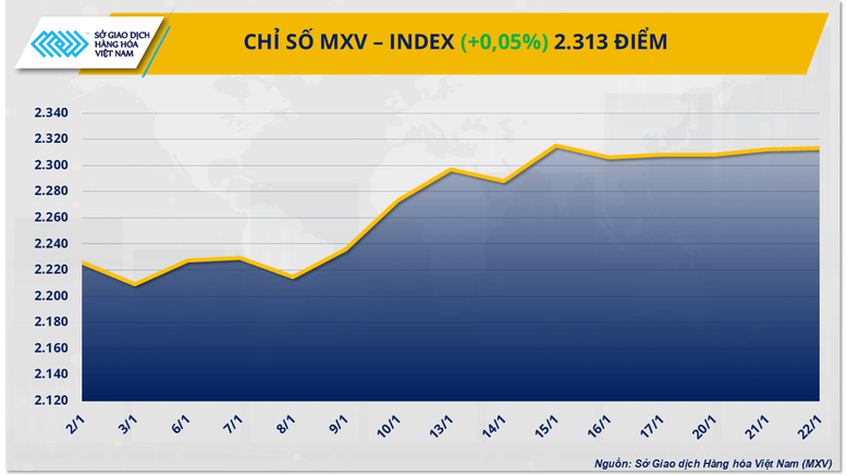 Theo Sở Giao dịch hàng hóa Việt Nam (MXV), thị trường hàng hóa nguyên liệu thế giới diễn biến phân hóa trong phiên giao dịch 22/1. Đóng cửa, chỉ số MXV-Index nhích nhẹ lên trên mức 2.313 điểm, nối dài chuỗi tăng 4 phiên liên tiếp.