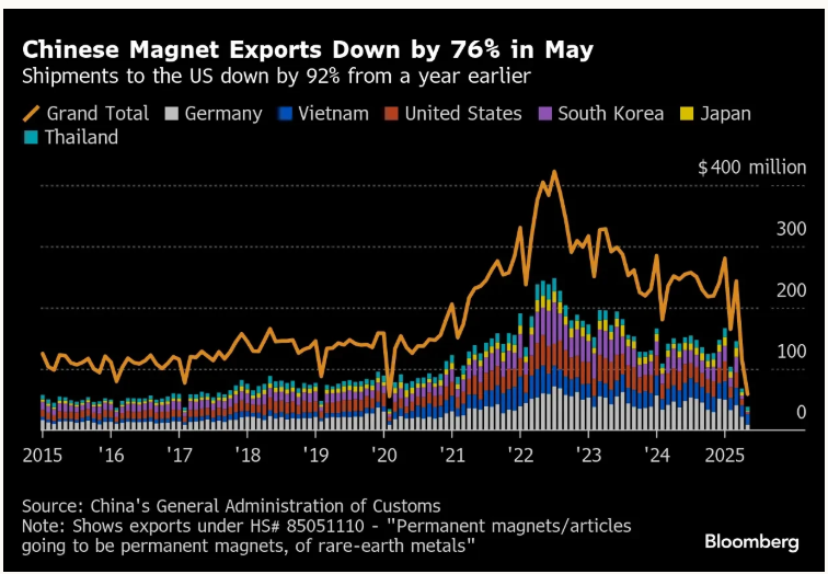 Xuất khẩu nam châm thiết yếu cho ngành công nghệ từ Trung Quốc sang Mỹ đã giảm mạnh trước khi phục hồi nhờ lệnh hòa hoãn giữa hai bên (Ảnh: Bloomberg)