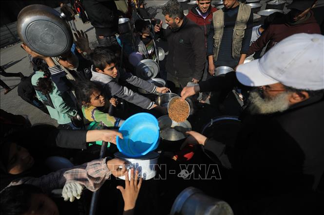 Các em nhỏ chờ được phát thực phẩm cứu trợ tại Rafah, Dải Gaza, ngày 14/2/2024. Ảnh: THX/TTXVN
