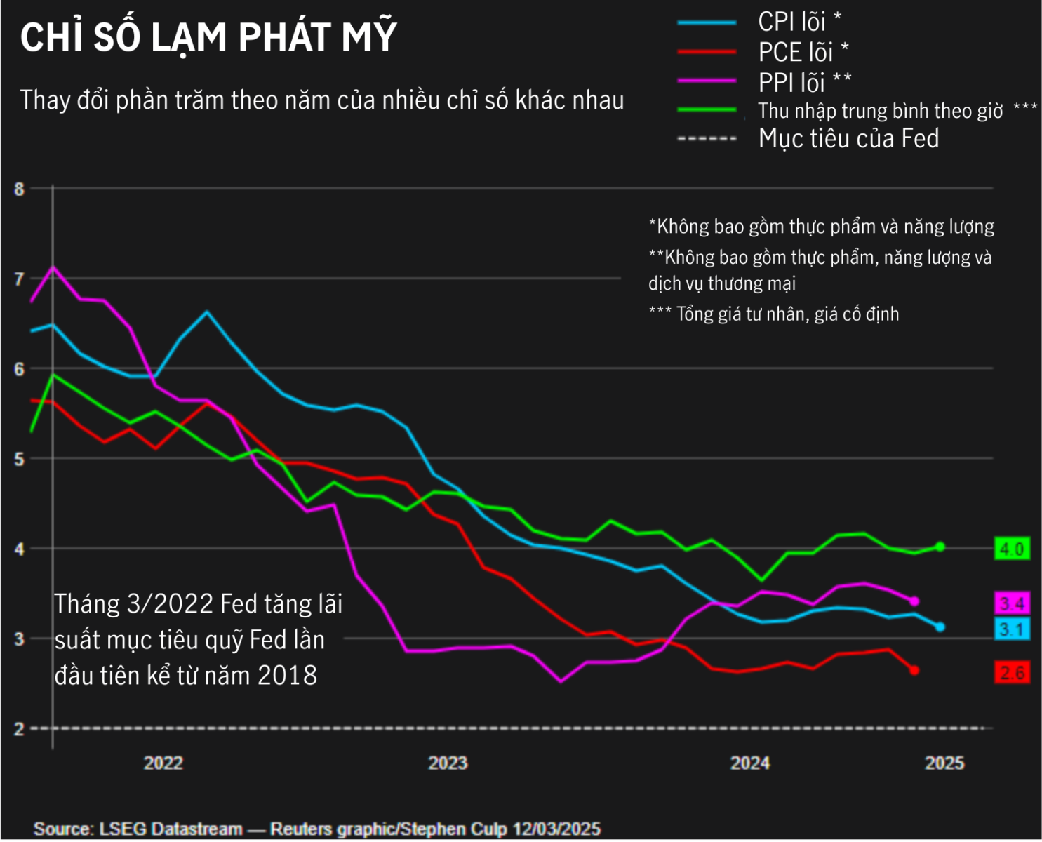 Lãi suất chuẩn của Fed hiện đang ở mức 4,25-4,50%, đã giảm 100 điểm cơ bản kể từ tháng 9/2024. Trước đó, mức lãi suất này đã tăng 5,25 điểm phần trăm vào năm 2022 và 2023 để kiểm soát lạm phát.