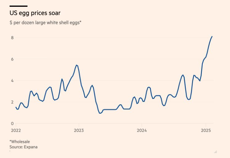 Cục thống kê lao động Mỹ (BLS) cho hay chỉ số giá tiêu dùng tháng 1/2025 đã tăng 3% so với cùng kỳ năm ngoái, đặc biệt mặt hàng trứng gà tăng hơn 50%.