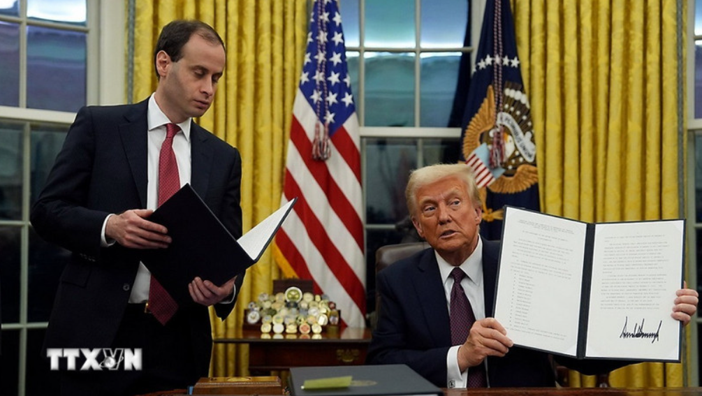 Tổng thống Mỹ Donald Trump (phải) ký một sắc lệnh hành pháp hồi đầu năm nay. (Ảnh: AP/TTXVN)