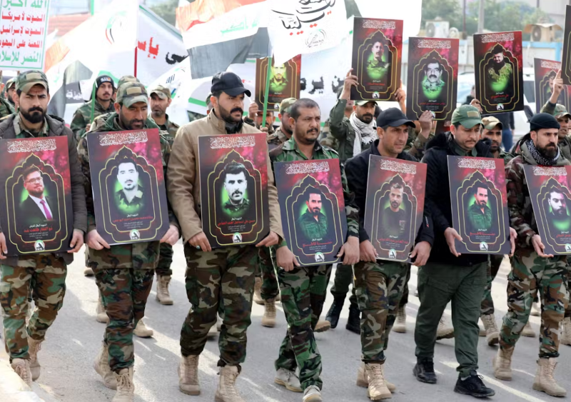 Các thành viên của Lực lượng Động viên Nhân dân (PMF) mang theo hình ảnh chiến binh thiệt mạng trong các cuộc không kích của Mỹ ở miền tây Iraq vào năm 2024. Ảnh: EPA