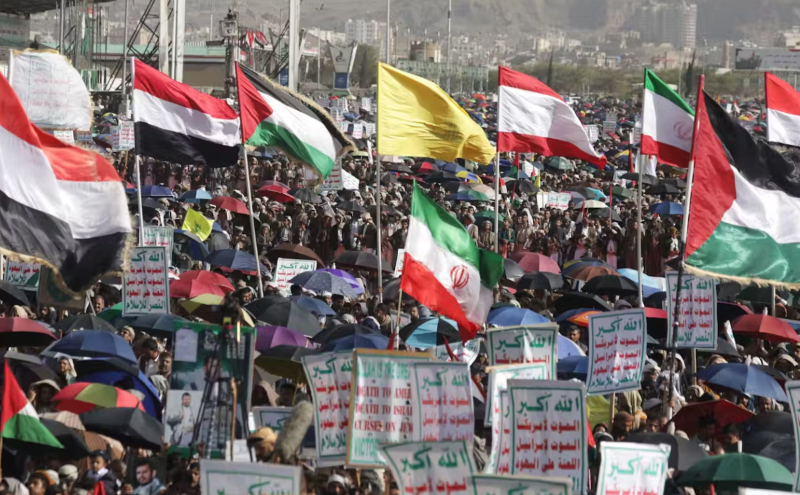 Những người ủng hộ Houthi giơ cao biểu ngữ chống Mỹ và Israel cũng như vẫy cờ của 'trục kháng cự' trong một cuộc biểu tình tại thủ đô Yemen. Ảnh: EPA