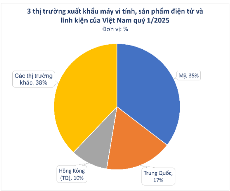 Về thị trường, Mỹ là thị trường xuất khẩu lớn nhất nhóm hàng này của Việt Nam. Tính chung 3 tháng đầu năm, kim ngạch xuất khẩu sang Mỹ đạt hơn 7,4 tỷ USD, tăng 48,2% so với cùng kỳ năm 2024. Đây cũng là nhóm hàng có giá trị xuất khẩu lớn nhất trong tất cả các mặt hàng được xuất sang Mỹ, chiếm 23,8% tỷ trọng xuất khẩu.