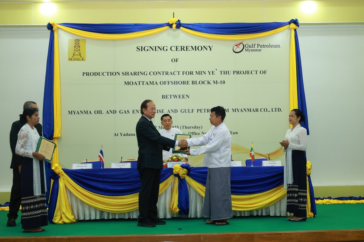 Ngày 29/5, Tập đoàn Dầu khí Myanmar (MOGE), đơn vị trực thuộc Bộ Năng lượng Myanmar, đã ký hợp đồng chia sản phẩm (PSC) với công ty Gulf Petroleum Myanmar – một doanh nghiệp Thái Lan đang hoạt động tại Myanmar – để triển khai thăm dò, khoan và khai thác dầu khí tại lô ngoài khơi Mottama (M-10), thuộc dự án có tên Min Ye Thu. Lễ ký kết diễn ra tại trụ sở Bộ Năng lượng ở Nay Pyi Taw.