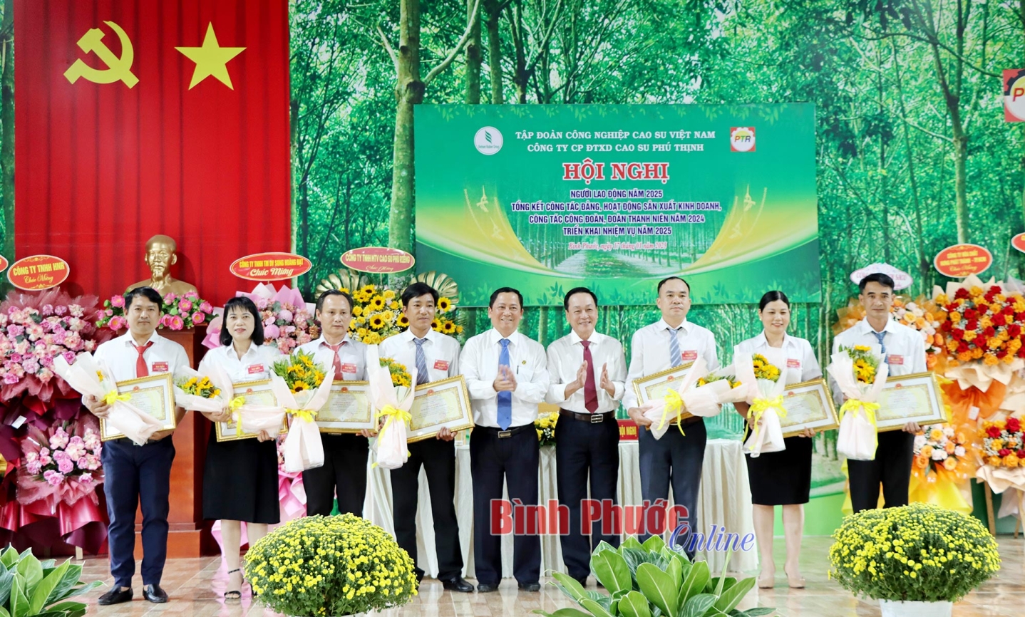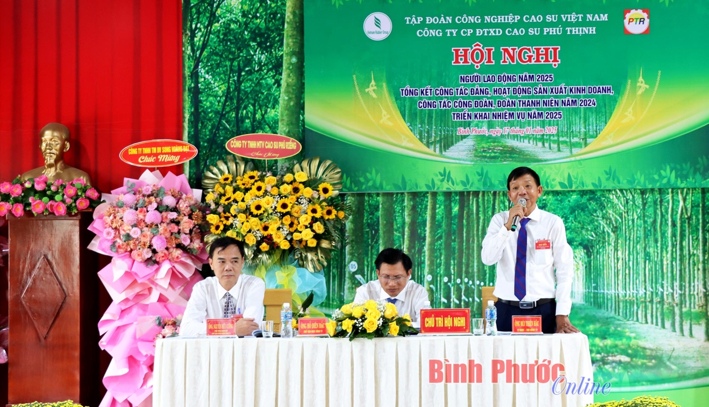 Chiều 17-1, Công ty Cổ phần đầu tư xây dựng cao su Phú Thịnh tổ chức hội nghị đại biểu người lao động và tổng kết công tác đảng, hoạt động sản xuất - kinh doanh năm 2024, triển khai nhiệm vụ năm 2025. Phó Tổng Giám đốc Tập đoàn Công nghiệp Cao su Việt Nam Trần Thanh Phụng dự hội nghị.
