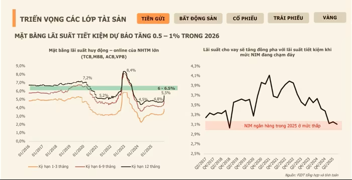 Tại tọa đàm quản lý gia sản 2026 diễn ra sáng nay (11/1), ông Bùi Văn Huy - Giám đốc Khối Nghiên cứu Đầu tư, CTCP Tư vấn đầu tư và Quản lý tài sản FIDT - nhận định, điểm xuất phát của mọi quyết định đầu tư, là câu chuyện lãi suất. Lãi suất huy động và cho vay đã bắt đầu tăng khoảng 0,5-0,75%, và theo ông Huy, nhiều khả năng tiếp tục nhích lên trong năm 2026.